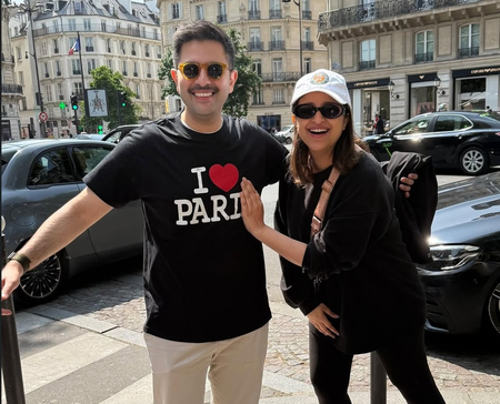 In the images, the couple can be seen twinning in black as they strike poses for the camera. Raghav wore a black t-shirt with “I love Paris” printed on it, while the ever-goofy Parineeti playfully hid the “s” in “Paris” with her hand while posing. The two flaunted their radiant smiles while striking poses together.