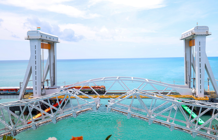 The newly constructed Pamban Bridge, connecting Rameswaram with the mainland, is India’s first vertical lift railway sea bridge. Built at a cost exceeding Rs. 700 crore, the 2.07 km structure includes a 72.5-metre vertical lift section that can rise 17 metres, allowing ships to pass safely without halting train movement.