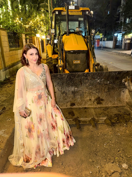 Soha on Wednesday morning took to Instagram, where she shared a string of pictures. In the first two photographs, Soha posed gracefully in front of a backhoe on a street dressed in a flowing, floral-printed lehenga with a sheer, embellished dupatta draped. The last few photographs had the actress posing at a Diwali party she attended.