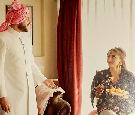 Soha took to Instagram, where she shared a picture from her wedding day. In the image, Saif is seen talking to Soha, who is having a plate of papaya while getting dolled up for her wedding.