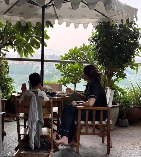 Sonam shared a slew of images featuring her son Vayu, husband Anand, and their newborn son alongside her. In the first image, the actress is seen having breakfast with her elder son.