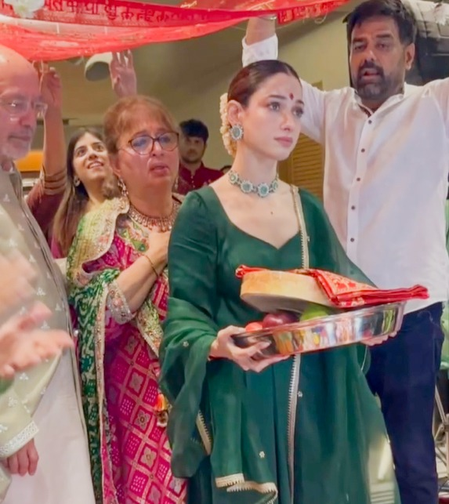The ‘Baahubali’ actress attended what looked like a ‘Mata Ki Chowki’. The video dropped by her on her IG showed Tamannaah putting Mehendi, dancing, and praying in front of Mata Rani during a devotional evening.